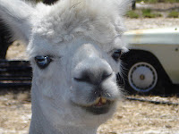 meet the family..... the alpacas .here is suzy she is a blue eyed white and is supposedly deaf but i sometimes wonder .she is also sterile [something to do with the white gene] but she is so sweet and gentle and the nuzzles she gives my small grandson are so lovely i wonder if she would have made a lovely mum...